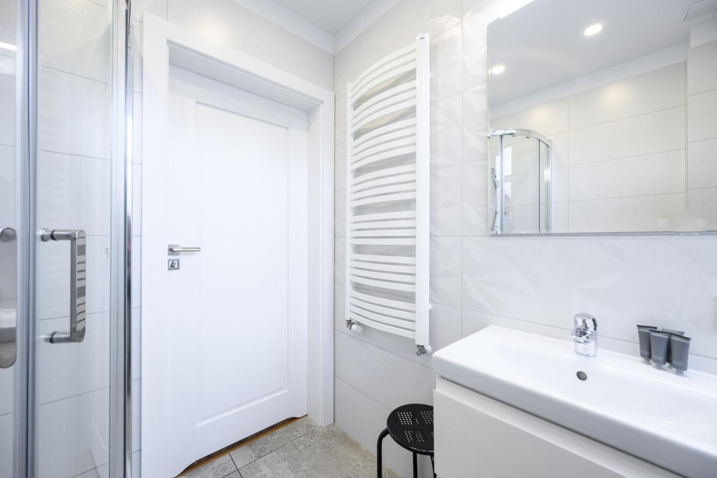 Studio. The studio features a dining area, a wardrobe, as well as a private bathroom boasting a shower and a hairdryer. Guests can make meals in the kitchenette that features a stovetop, a refrigerator, kitchenware and an electric kettle. This studio provides heating, a flat-screen TV and a quiet street view. The unit has 2 beds. Studio - 3 osobowy. Powierzchnia pokoju ok.: 21 mkw.
